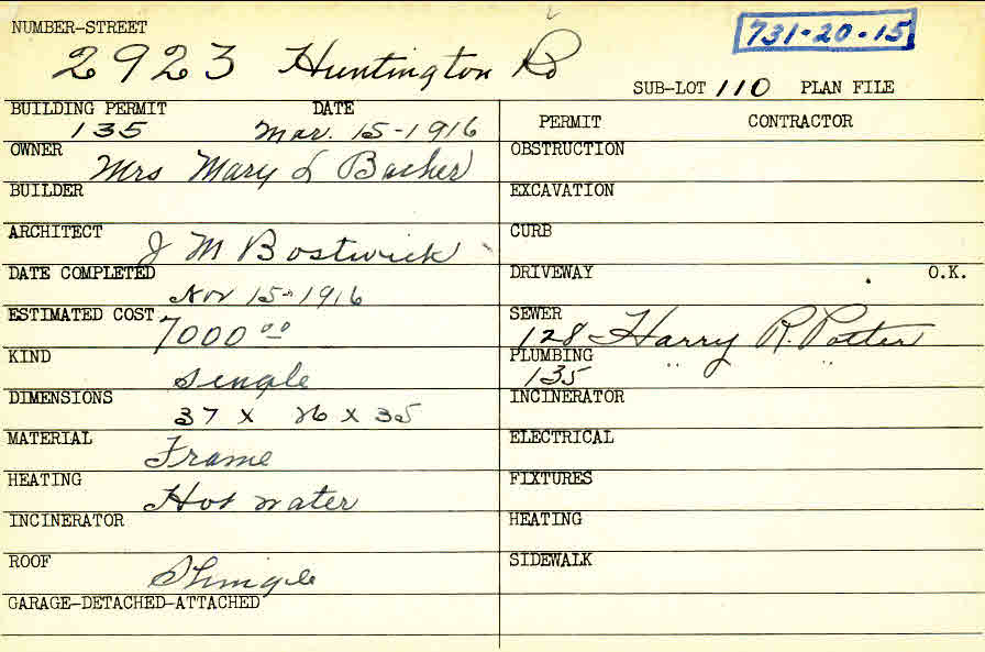 2923 Huntington Road Shaker Heights, OH 44120 PARCEL ID: 731-20-015 Building Permit Date: 03-15-1916 Plan File Number: 4290 scanned, 10828 Microfilm Roll: Roll062, NewRoll#6 Neighborhood: Boulevard Owner: Backer, Mary L. Architect: Bostwick, J. M. Estimated Cost: 7000 Date Completed: 11-15-1916 Kind: Single, Single Residence or Dwelling Material: Frame Heating: Hot Water Roof: Shingles |