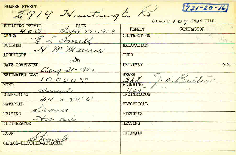 2919 Huntington Road Shaker Heights, OH 44120 PARCEL ID: 731-20-016 Building Permit Date: 09-22-1919 Plan File Number: 2545, 2748, 4702 Microfilm Roll: Roll #36, Roll #38, Roll#65 Neighborhood: Boulevard Owner: Smith, E. L. Builder: Maurer, H. W. Architect: Maurer, H. W. Estimated Cost: 10000 Date Completed: 08-31-1920 Kind: Single, Single Residence or Dwelling Material: Frame Heating: Hot Air Roof: Shingles |