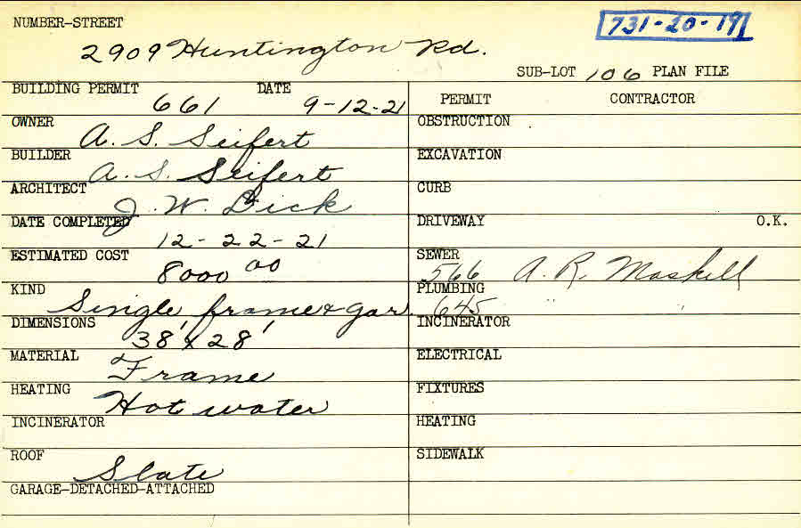 2909 Huntington Road Shaker Heights, OH 44120 PARCEL ID: 731-20-019 Building Permit Date: 09-12-1921 Plan File Number: 3892, 6596 Microfilm Roll: Roll#57, Roll#87 Neighborhood: Boulevard Owner: Seifert, A. S. Builder: Seifert, A. S. Architect: Dick, J. W. Estimated Cost: 8000 Date Completed: 12-22-1921 Kind: Single Dwelling and Garage Material: Frame Heating: Hot Water Roof: Slate |