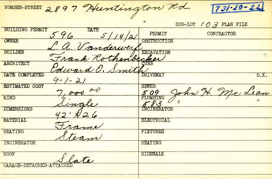 2897 Huntington Road Shaker Heights, OH 44120 PARCEL ID: 731-20-022 Building Permit Date: 05-14-1921 Plan File Number: 0 Neighborhood: Boulevard Owner: Vanderwerf, L. A. Builder: Rothenbecker, Frank Architect: Smith, Edward E. Estimated Cost: 7000 Date Completed: 09-01-1921 Kind: Single, Single Residence or Dwelling Material: Frame Heating: Steam Roof: Slate Card Available: yes |