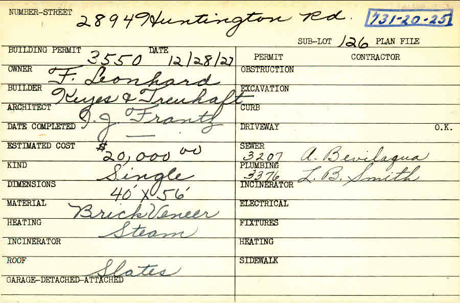 2894 Huntington Road Shaker Heights, OH 44120 PARCEL ID: 731-20-025 Building Permit Date: 12-28-1927 Plan File Number: 0 Neighborhood: Boulevard Owner: Leonhard, F. Builder: Keyes and Treuhaft Architect: Frantz, Irvin J. Estimated Cost: 20000 Kind: Single, Single Residence or Dwelling Material: Brick Veneer Heating: Steam Roof: Slate |