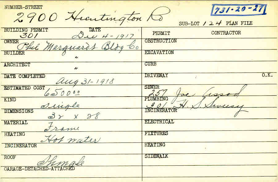 2900 Huntington Road Shaker Heights, OH 44120 PARCEL ID: 731-20-027 Building Permit Date: 12-04-1917 Plan File Number: 10189 Microfilm Roll: NewRoll#2 Neighborhood: Boulevard Owner: Phil Marquardt Building Company Builder: Phil Marquardt Building Company Architect: Phil Marquardt Building Company Estimated Cost: 6500 Date Completed: 08-31-1918 Kind: Single, Single Residence or Dwelling Material: Frame Heating: Hot Water Roof: Shingles |