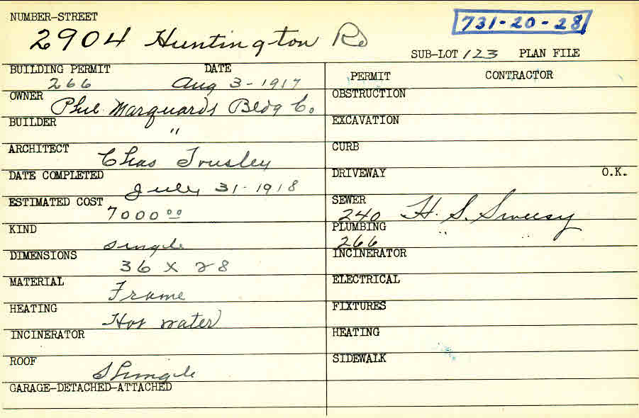 2904 Huntington Road Shaker Heights, OH 44120 PARCEL ID: 731-20-028 Building Permit Date: 08-03-1917 Plan File Number: 4296 scanned, 6697 Microfilm Roll: Roll062, Roll#87 Neighborhood: Boulevard Owner: Phil Marquardt Building Company Builder: Phil Marquardt Building Company Architect: Trusley, Charles Estimated Cost: 7000 Date Completed: 07-31-1918 Kind: Single, Single Residence or Dwelling Material: Frame Heating: Hot Water Roof: Shingles |