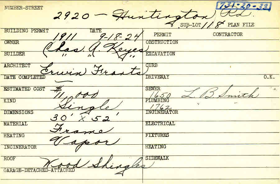 2920 Huntington Road Shaker Heights, OH 44120 PARCEL ID: 731-20-033 Building Permit Date: 09-18-1924 Plan File Number: 5220, 12865 Microfilm Roll: Roll#72, NewRoll#18 Neighborhood: Boulevard Owner: Keyes, Charles A. Builder: Keyes, Charles A. Architect: Frants, Erwin Estimated Cost: 11000 Kind: Single, Single Residence or Dwelling Material: Frame Heating: Vapor Roof: Wood Shingle |