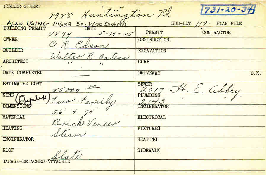 2928 Huntington Road Shaker Heights, OH 44120 PARCEL ID: 731-20-034 Building Permit Date: 05-14-1925 Plan File Number: 0 Neighborhood: Boulevard Owner: Edson, C. R. Builder: Oatess, Walter R. Architect: Oatess, Walter R. Estimated Cost: 25000 Kind: Duplex or Two-Family Material: Brick Veneer Heating: Steam Roof: Slate Card Available: yes |