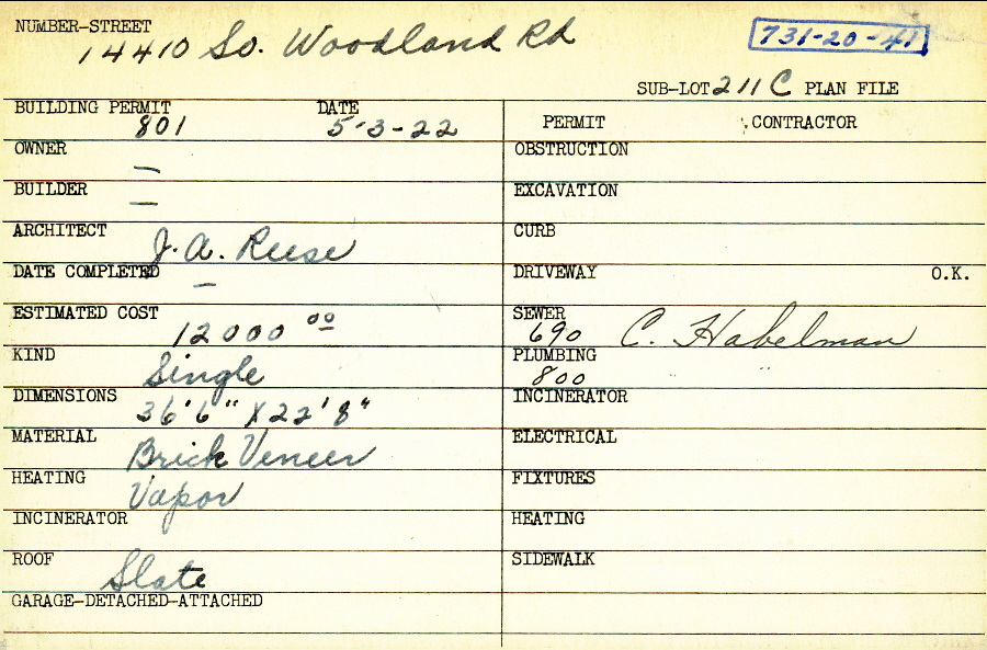 14410 South Woodland Road Shaker Heights, OH 44120 PARCEL ID: 731-20-041 Building Permit Date: 05-03-1922 Plan File Number: 0 Architect: Reese, James A. Estimated Cost: 12000 Kind: Single, Single Residence or Dwelling Material: Brick Veneer Heating: Vapor Roof: Slate |