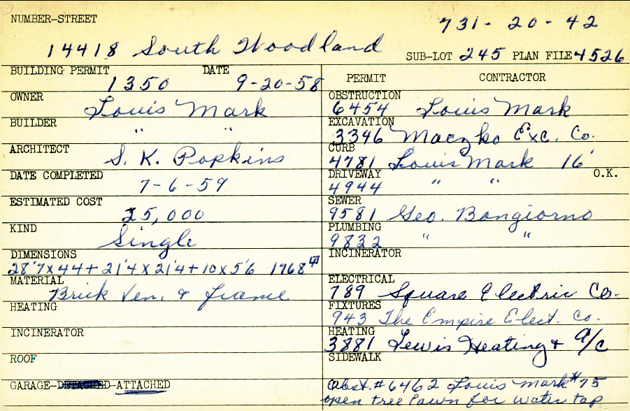 14418 South Woodland Road Shaker Heights, OH 44120 PARCEL ID: 731-20-042 Building Permit Date: 09-20-1958 Plan File Number: 4526 scanned Microfilm Roll: Roll063 Owner: Mark, Louis Builder: Mark, Louis Architect: Popkins, Samuel K. Estimated Cost: 25000 Date Completed: 07-06-1959 Kind: Single, Single Residence or Dwelling Material: Brick Veneer and Frame Garage: attached |