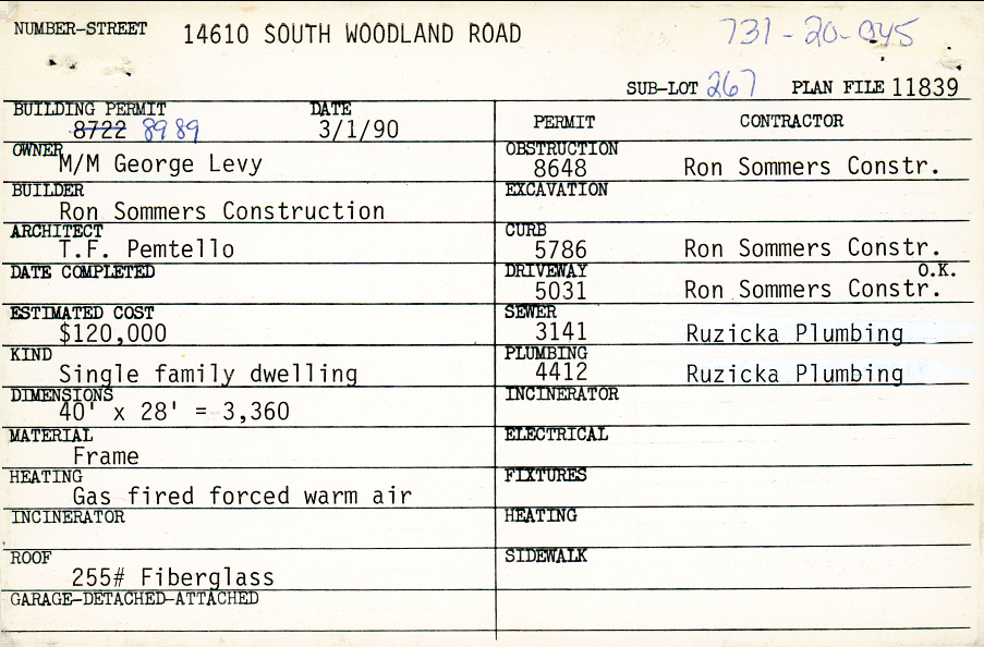 14610 South Woodland Road Shaker Heights, OH 44120 PARCEL ID: 731-20-045 Building Permit Date: 03-01-1990 Plan File Number: 4611, 11839* Microfilm Roll: Roll#65, NewRoll#9 Neighborhood: Boulevard Owner: Levy, Mr. and Mrs. George Builder: Ron Sommers Construction Architect: Pemtello, T. F. Estimated Cost: 120000 Kind: Single, Single Residence or Dwelling Material: Frame Heating: Forced Air - Gas |