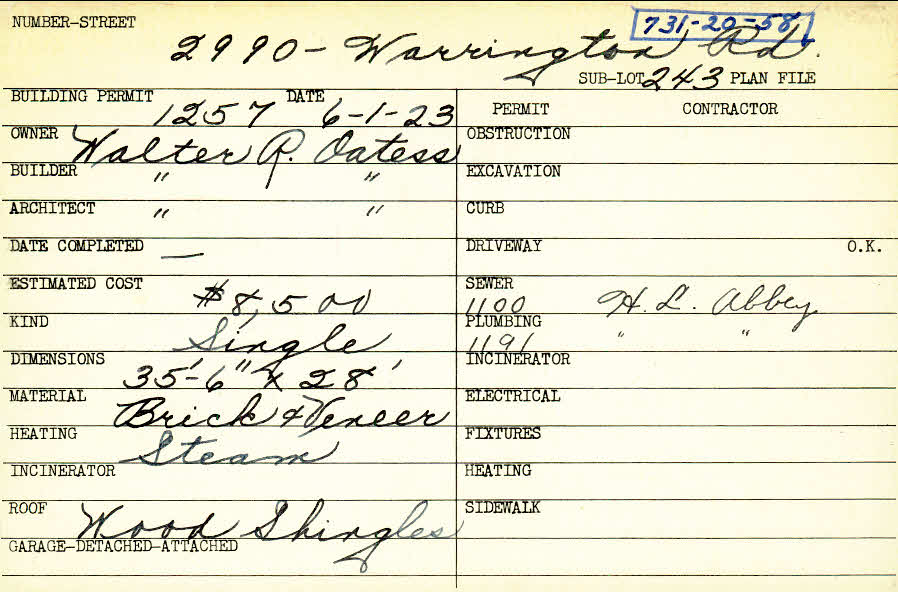 2990 Warrington Road Shaker Heights, OH 44120 PARCEL ID: 731-20-058 Building Permit Date: 06-01-1923 Plan File Number: 0 Neighborhood: Onaway Owner: Oatess, Walter R. Builder: Oatess, Walter R. Architect: Oatess, Walter R. Estimated Cost: 8500 Kind: Single, Single Residence or Dwelling Material: Brick and Veneer Heating: Steam Roof: Wood Shingle |