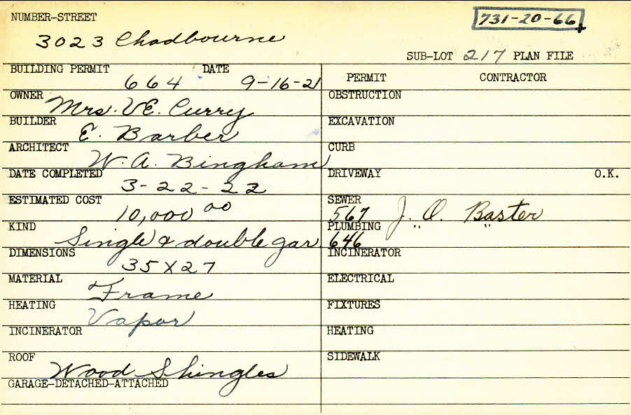 3023 Chadbourne Road Shaker Heights, OH 44120 PARCEL ID: 731-20-066 Building Permit Date: 09-16-1921 Plan File Number: 0 Neighborhood: Onaway Owner: Curry, Mrs. V. E. Builder: Barber, E. Architect: Bingham, William A. Estimated Cost: 10000 Date Completed: 03-22-1922 Kind: Single Dwelling and Garage Material: Frame Heating: Vapor Roof: Wood Shingle |