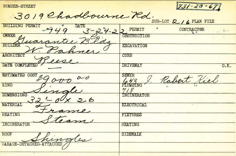 3019 Chadbourne Road Shaker Heights, OH 44120 PARCEL ID: 731-20-067 Building Permit Date: 03-24-1922 Plan File Number: 0 Owner: Guarantee Building Builder: Pahner, W. Architect: Reese, James A. Estimated Cost: 9000 Kind: Single, Single Residence or Dwelling Material: Frame Heating: Steam Roof: Shingles |