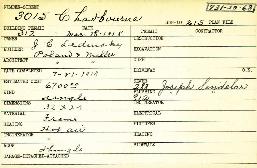 3015 Chadbourne Road Shaker Heights, OH 44120 PARCEL ID: 731-20-068 Building Permit Date: 03-28-1918 Plan File Number: 0 Neighborhood: Onaway Owner: Ledinsky, J. C. Builder: Poland and Miller Architect: Poland and Miller Estimated Cost: 6700 Date Completed: 07-21-1918 Kind: Single, Single Residence or Dwelling Material: Frame Heating: Hot Air Roof: Shingles |