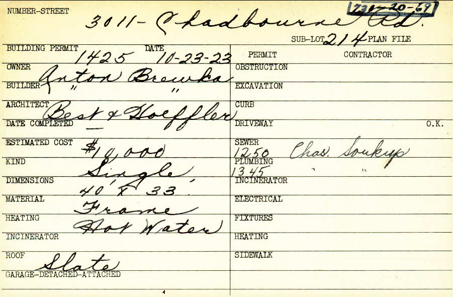3011 Chadbourne Road Shaker Heights, OH 44120 PARCEL ID: 731-20-069 Building Permit Date: 10-23-1923 Plan File Number: 0 Neighborhood: Onaway Owner: Brewka, Anton Builder: Brewka, Anton Architect: Best and Hoefler Estimated Cost: 10000 Kind: Single, Single Residence or Dwelling Material: Frame Heating: Hot Water Roof: Slate |