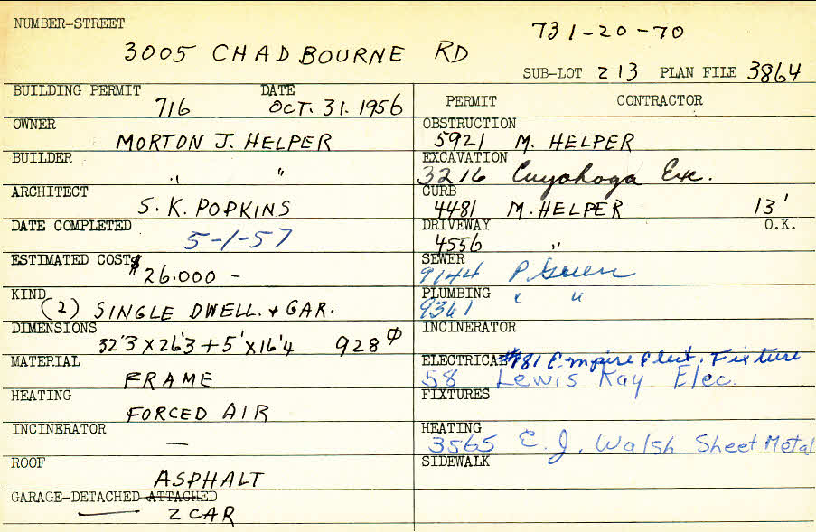 3005 Chadbourne Road Shaker Heights, OH 44120 PARCEL ID: 731-20-070 Building Permit Date: 10-31-1956 Plan File Number: 3864 Microfilm Roll: Roll#56 Neighborhood: Onaway Owner: Helper, Morton J. Builder: Helper, Morton J. Architect: Popkins, Samuel K. Estimated Cost: 26000 Date Completed: 05-01-1957 Kind: Single Dwelling and Garage (2) Material: Frame Heating: Forced Air Roof: Asphalt Garage: detached 2 car |