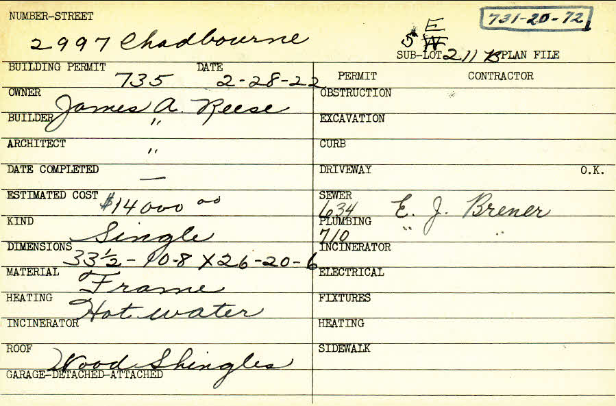2997 Chadbourne Road Shaker Heights, OH 44120 PARCEL ID: 731-20-072 Building Permit Date: 02-28-1922 Plan File Number: 0 Neighborhood: Onaway Owner: Reese, James A. Builder: Reese, James A. Architect: Reese, James A. Estimated Cost: 14000 Kind: Single, Single Residence or Dwelling Material: Frame Heating: Hot Water Roof: Wood Shingle |