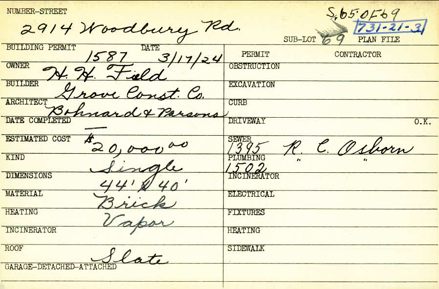 2914 Woodbury Road Shaker Heights, OH 44120 PARCEL ID: 731-21-003 Building Permit Date: 03-17-1924 Plan File Number: 0 Neighborhood: Boulevard Owner: Field, H. H. Builder: Grove Construction Company Architect: Bohnard and Parsson Estimated Cost: 20000 Kind: Single, Single Residence or Dwelling Material: Brick Heating: Vapor Roof: Slate |