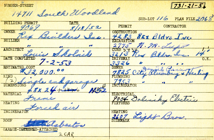14711 South Woodland Road Shaker Heights, OH 44120 PARCEL ID: 731-21-005 Building Permit Date: 08-18-1952 Plan File Number: 2068 Microfilm Roll: Roll#31 Neighborhood: Boulevard Owner: Rex Builders Inc. Builder: Rex Builders Inc. Architect: Skolnik, Louis Estimated Cost: 32000 Date Completed: 07-02-1953 Kind: Single Dwelling and Garage (2) Material: Frame Heating: Forced Air Roof: Asbestos Garage: attached 2 car |
