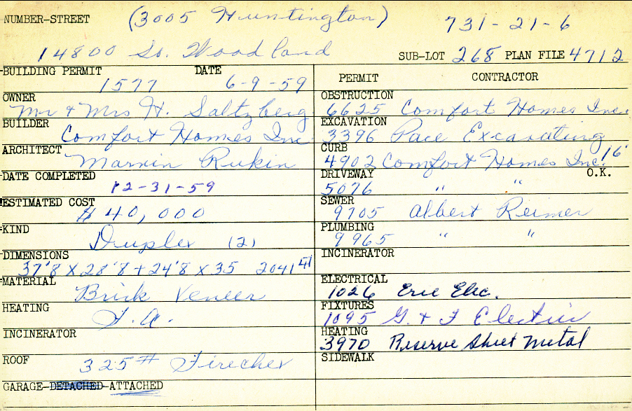 14800 South Woodland Road Shaker Heights, OH 44120 PARCEL ID: 731-21-006 Building Permit Date: 06-09-1959 Plan File Number: 4712 Microfilm Roll: Roll#65 Neighborhood: Boulevard Owner: Saltzberg, Mr. and Mrs. H. Builder: Comfort Homes Inc. Architect: Rukin, Marvin Estimated Cost: 40000 Date Completed: 12-31-1959 Kind: Duplex or Two-Family Material: Brick Veneer Heating: Forced Air Roof: 325# Asphalt Garage: attached |