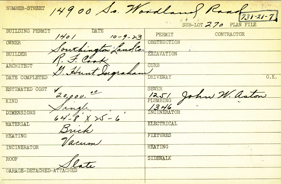 14900 South Woodland Road Shaker Heights, OH 44120 PARCEL ID: 731-21-007 Building Permit Date: 10-09-1923 Plan File Number: 9188 Microfilm Roll: Roll#102 Neighborhood: Boulevard Owner: Southington Land Company Builder: Cook, R. F. Architect: Ingraham, G. Hunt Estimated Cost: 20000 Kind: Single, Single Residence or Dwelling Material: Brick Roof: Slate |