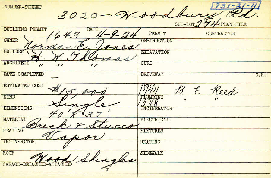 3020 Woodbury Road Shaker Heights, OH 44120 PARCEL ID: 731-21-011 Building Permit Date: 04-09-1924 Plan File Number: 0 Neighborhood: Onaway Owner: Jones, Norman E. Builder: Thomas, H. W. Architect: Thomas, H. W. Estimated Cost: 15000 Kind: Single, Single Residence or Dwelling Material: Brick and Stucco Heating: Vapor Roof: Wood Shingle |