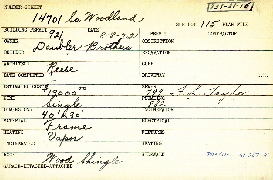 14701 South Woodland Road Shaker Heights, OH 44120 PARCEL ID: 731-21-016 Building Permit Date: 08-08-1922 Plan File Number: 5334 Microfilm Roll: Roll#73 Owner: Daubler Brothers Builder: Daubler Brothers Architect: Reese, James A. Estimated Cost: 13000 Kind: Single, Single Residence or Dwelling Material: Frame Heating: Vapor Roof: Wood Shingle |