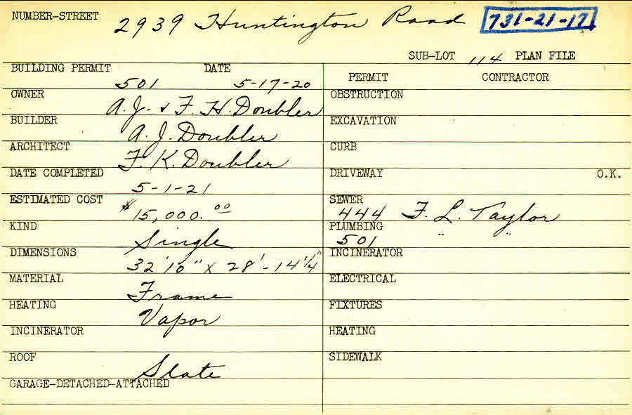 2939 Huntington Road Shaker Heights, OH 44120 PARCEL ID: 731-21-017 Building Permit Date: 05-17-1920 Plan File Number: 5969, 7465 Microfilm Roll: Roll#80, Roll#93 Neighborhood: Boulevard Owner: Doubler, A. J. and F.H. Builder: Doubler, A. J. Architect: Doubler, F. K. Estimated Cost: 15000 Date Completed: 05-01-1921 Kind: Single, Single Residence or Dwelling Material: Frame Heating: Vapor Roof: Slate |