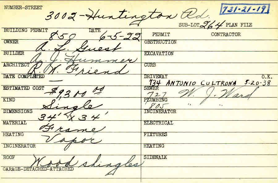 3002 Huntington Road Shaker Heights, OH 44120 PARCEL ID: 731-21-019 Building Permit Date: 06-05-1922 Plan File Number: 0 Neighborhood: Onaway Owner: Guest, A. L. Builder: Hummer, A. J. Architect: Friend, R. W. Estimated Cost: 9300 Kind: Single, Single Residence or Dwelling Material: Frame Heating: Vapor Roof: Wood Shingle Card Available: yes |