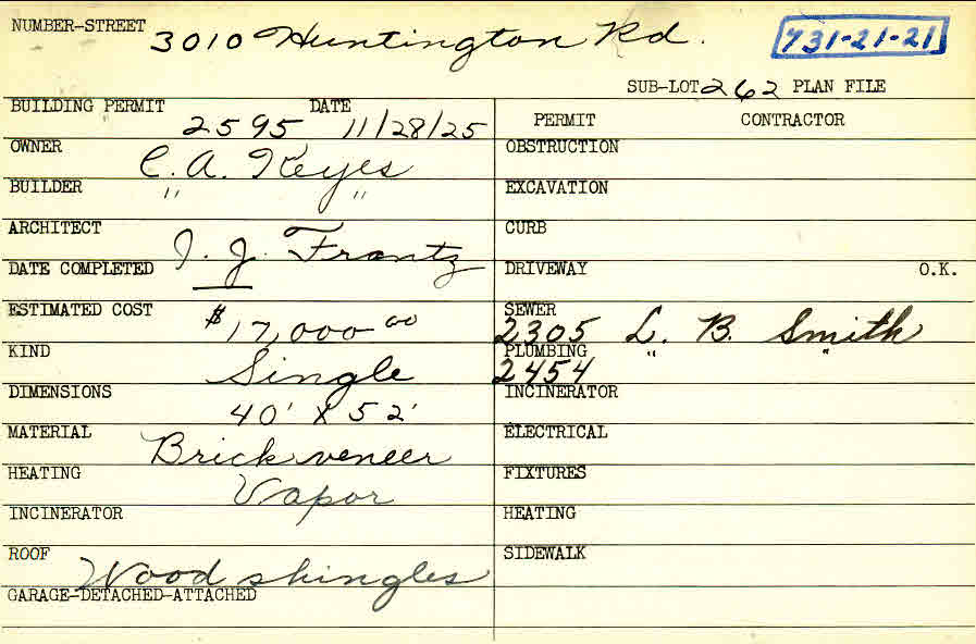 3010 Huntington Road Shaker Heights, OH 44120 PARCEL ID: 731-21-021 Building Permit Date: 11-28-1925 Plan File Number: 0 Neighborhood: Onaway Owner: Keyes, C. A. Builder: Keyes, C. A. Architect: Frantz, Irvin J. Estimated Cost: 17000 Kind: Single, Single Residence or Dwelling Material: Brick Veneer Heating: Vapor Roof: Wood Shingle |