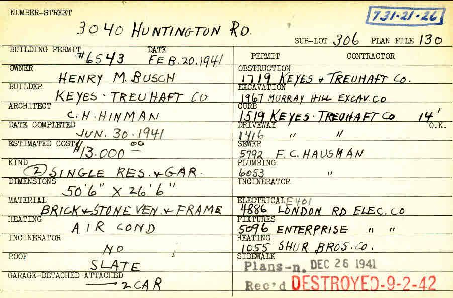 3040 Huntington Road Shaker Heights, OH 44120 PARCEL ID: 731-21-026 Building Permit Date: 02-20-1941 Plan File Number: 1733 all scanned Microfilm Roll: Roll026 Neighborhood: Onaway Owner: Busch, Henry M. Builder: Keyes-Treuhaft Company Architect: Hinman, C. H. Estimated Cost: 13000 Date Completed: 06-30-1941 Kind: Single Dwelling and Garage (2) Material: Brick and Stone Veneer and Frame Heating: Air Conditioned Roof: Slate Garage: attached 2 car |