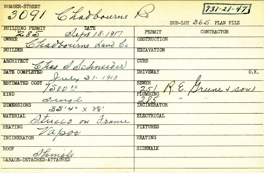 3091 Chadbourne Road Shaker Heights, OH 44120 PARCEL ID: 731-21-047 Building Permit Date: 09-18-1917 Plan File Number: 0 Neighborhood: Onaway Owner: Chadbourne Land Company Architect: Schneider, Charles S. Estimated Cost: 7500 Date Completed: 07-31-1918 Kind: Single, Single Residence or Dwelling Material: Stucco on Frame Heating: Vapor Roof: Shingles |