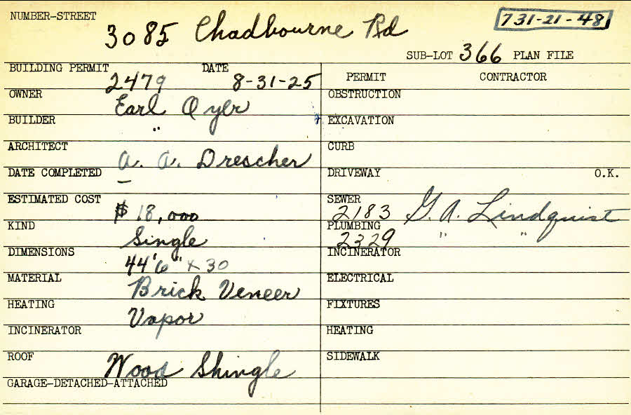 3085 Chadbourne Road Shaker Heights, OH 44120 PARCEL ID: 731-21-048 Building Permit Date: 08-31-1925 Plan File Number: 0 Neighborhood: Onaway Owner: Oyer, Earl F. Builder: Oyer, Earl F. Architect: Drescher, A. A. Estimated Cost: 18000 Kind: Single, Single Residence or Dwelling Material: Brick Veneer Heating: Vapor Roof: Wood Shingle |