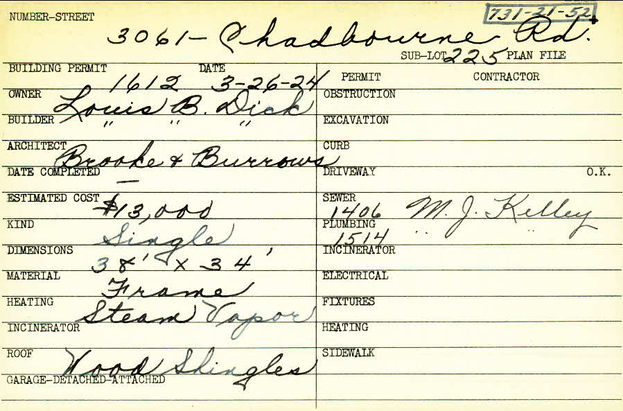 3061 Chadbourne Road Shaker Heights, OH 44120 PARCEL ID: 731-21-052 Building Permit Date: 03-26-1924 Plan File Number: 7695, 10725 Microfilm Roll: Roll#94, NewRoll#5 Neighborhood: Onaway Owner: Dick, Louis B. Builder: Dick, Louis B. Architect: Brooke and Burrows Estimated Cost: 13000 Kind: Single, Single Residence or Dwelling Material: Frame Heating: Steam Roof: Wood Shingle |