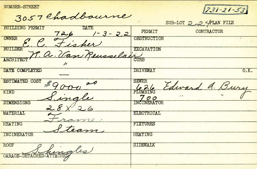 3057 Chadbourne Road Shaker Heights, OH 44120 PARCEL ID: 731-21-053 Building Permit Date: 01-03-1922 Plan File Number: 0 Owner: Fisher, E. C. Builder: Van Rensselaer, Richard Abram Architect: Van Rensselaer, Richard Abram Estimated Cost: 9000 Kind: Single, Single Residence or Dwelling Material: Frame Heating: Steam Roof: Shingles |