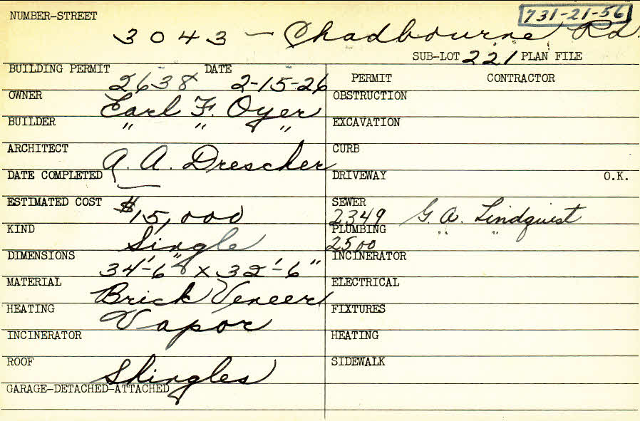 3043 Chadbourne Road Shaker Heights, OH 44120 PARCEL ID: 731-21-056 Building Permit Date: 02-15-1926 Plan File Number: 0 Neighborhood: Onaway Owner: Oyer, Earl F. Builder: Oyer, Earl F. Architect: Drescher, A. A. Estimated Cost: 15000 Kind: Single, Single Residence or Dwelling Material: Brick Veneer Heating: Vapor Roof: Shingles |