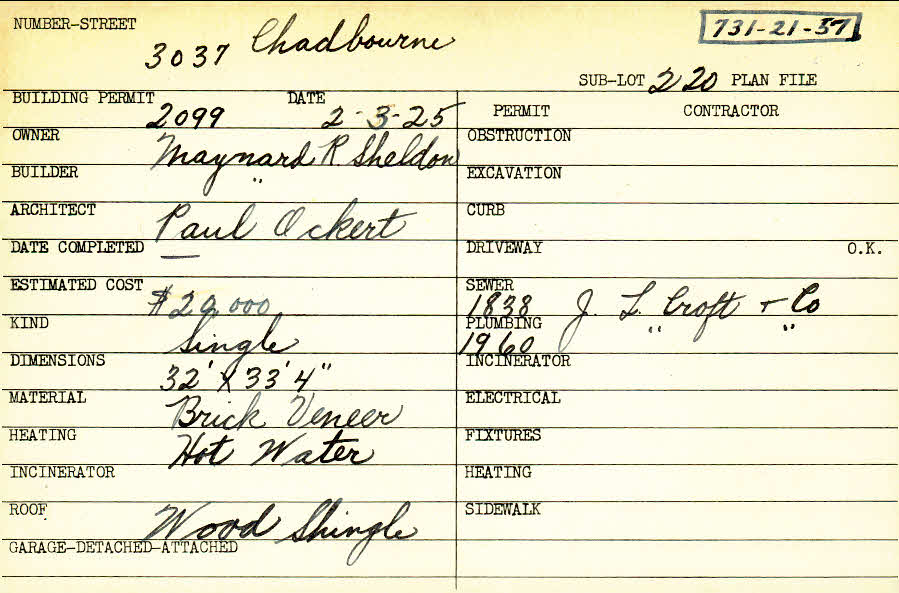 3037 Chadbourne Road Shaker Heights, OH 44120 PARCEL ID: 731-21-057 Building Permit Date: 02-03-1925 Plan File Number: 7948 Microfilm Roll: Roll#95 Neighborhood: Onaway Owner: Sheldon, Maynard R. Builder: Sheldon, Maynard R. Architect: Ockert, Paul Estimated Cost: 20000 Kind: Single, Single Residence or Dwelling Material: Brick Veneer Heating: Hot Water Roof: Wood Shingle |