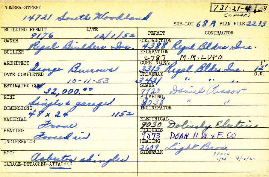 14721 South Woodland Road Shaker Heights, OH 44120 PARCEL ID: 731-21-058 Building Permit Date: 12-01-1952 Plan File Number: 2213, 5675 Microfilm Roll: Roll#33, Roll#77 Neighborhood: Boulevard Owner: Regal Builders Inc. Architect: Burrows, George Estimated Cost: 32000 Date Completed: 10-11-1953 Kind: Single Dwelling and Garage Material: Frame Heating: Forced Air Roof: Asbestos Shingles Garage: attached |