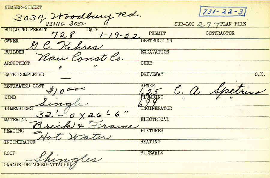 3032 Woodbury Road Shaker Heights, OH 44120 PARCEL ID: 731-22-003 Building Permit Date: 01-19-1922 Plan File Number: 0 Neighborhood: Onaway Owner: Kehres, G. C. Builder: Rau Construction Company Architect: Rau Construction Company Estimated Cost: 10000 Kind: Single, Single Residence or Dwelling Material: Brick and Frame Heating: Hot Water Roof: Shingles |
