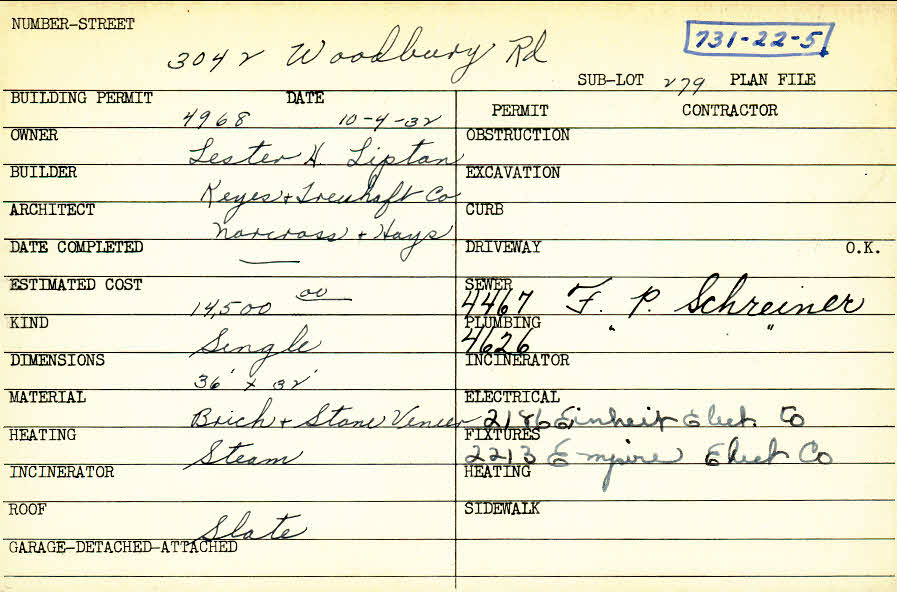 3042 Woodbury Road Shaker Heights, OH 44120 PARCEL ID: 731-22-005 Building Permit Date: 10-04-1932 Plan File Number: 0 Neighborhood: Onaway Owner: Lipton, Lester H. Builder: Keyes and Treuhaft Company Architect: Norcross and Hays Estimated Cost: 14500 Kind: Single, Single Residence or Dwelling Material: Brick and Stone Veneer Heating: Steam Roof: Slate |