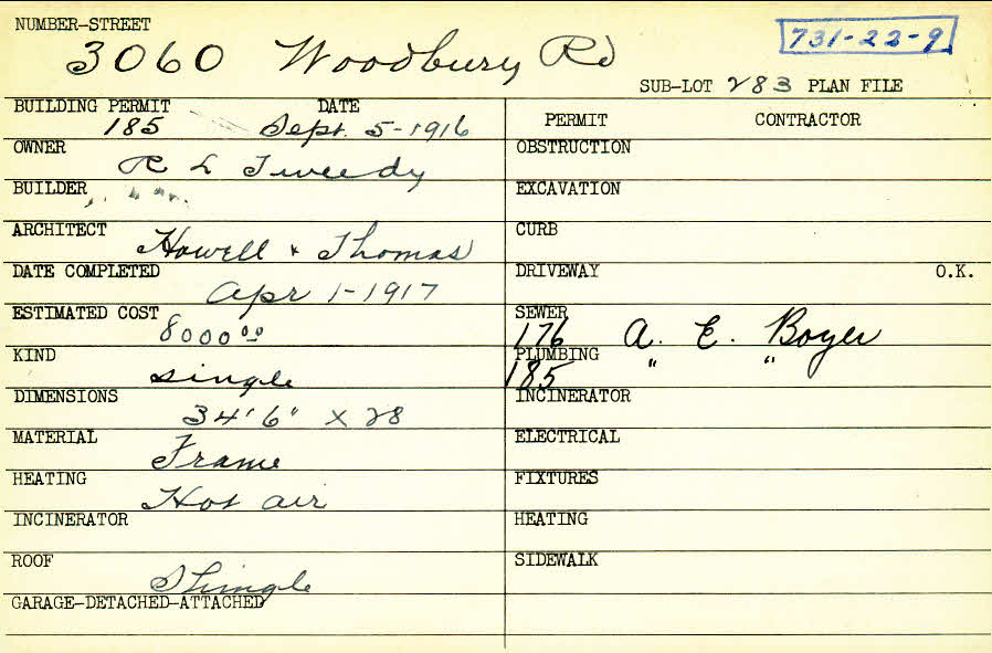 3060 Woodbury Road Shaker Heights, OH 44120 PARCEL ID: 731-22-009 Building Permit Date: 09-05-1916 Plan File Number: 0 Neighborhood: Onaway Owner: Tweedy, R. L. Architect: Howell and Thomas Estimated Cost: 8000 Date Completed: 04-01-1917 Kind: Single, Single Residence or Dwelling Material: Frame Heating: Hot Air Roof: Shingles |  |