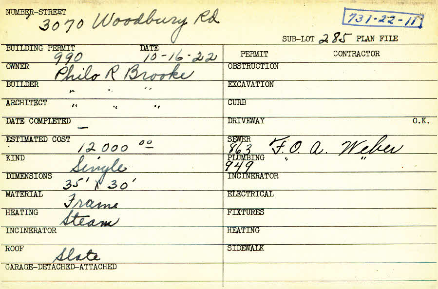 3070 Woodbury Road Shaker Heights, OH 44120 PARCEL ID: 731-22-011 Building Permit Date: 10-16-1922 Plan File Number: 22 all scanned Microfilm Roll: Roll001 Neighborhood: Onaway Owner: Brooke, Philo R. Builder: Brooke, Philo R. Architect: Brooke, Philo R. Estimated Cost: 12000 Kind: Single, Single Residence or Dwelling Material: Frame Heating: Steam Roof: Slate |  |