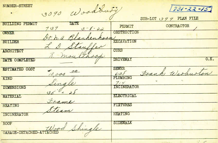 3090 Woodbury Road Shaker Heights, OH 44120 PARCEL ID: 731-22-015 Building Permit Date: 03-08-1922 Plan File Number: 11236, 12019 Microfilm Roll: NewRoll#7, NewRoll#10 Neighborhood: Onaway Owner: Blankenhorn, Dr. M. A. Builder: Stauffer, L. D. Architect: Moulthrop, R. Estimated Cost: 10000 Kind: Single, Single Residence or Dwelling Material: Frame Heating: Steam Roof: Wood Shingle |  |