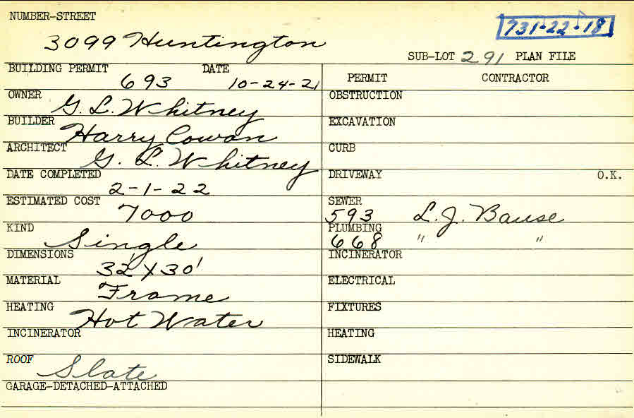 3099 Huntington Road Shaker Heights, OH 44120 PARCEL ID: 731-22-018 Building Permit Date: 10-24-1921 Plan File Number: 0 Neighborhood: Onaway Owner: Whitney, G. L. Builder: Cowan, Harry Architect: Whitney, G. L. Estimated Cost: 7000 Date Completed: 02-01-1922 Kind: Single, Single Residence or Dwelling Material: Frame Heating: Hot Water Roof: Slate |