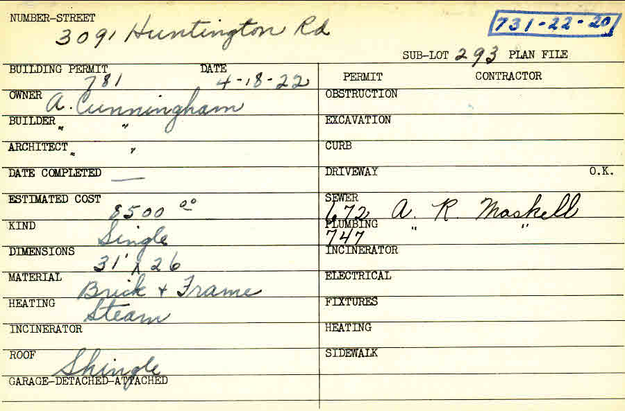 3091 Huntington Road Shaker Heights, OH 44120 PARCEL ID: 731-22-020 Building Permit Date: 04-18-1922 Plan File Number: 0 Neighborhood: Onaway Owner: Cunningham, A. Builder: Cunningham, A. Architect: Cunningham, A. Estimated Cost: 8500 Kind: Single, Single Residence or Dwelling Material: Brick and Frame Heating: Steam Roof: Shingles Card Available: yes |