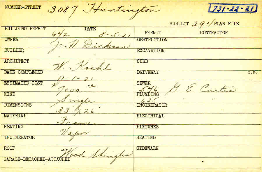 3087 Huntington Road Shaker Heights, OH 44120 PARCEL ID: 731-22-021 Building Permit Date: 08-05-1921 Plan File Number: 0 Neighborhood: Onaway Owner: Dickson, J. H. Builder: Dickson, J. H. Architect: Koehl, W. Estimated Cost: 7000 Date Completed: 11-01-1921 Kind: Single, Single Residence or Dwelling Material: Frame Heating: Vapor Roof: Wood Shingle Card Available: yes |