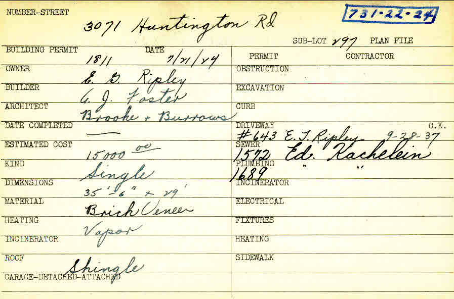 3071 Huntington Road Shaker Heights, OH 44120 PARCEL ID: 731-22-024 Building Permit Date: 07-21-1924 Plan File Number: 0 Neighborhood: Onaway Owner: Ripley, E. G. Builder: Foster, A. J. Architect: Brooke and Burrows Estimated Cost: 15000 Kind: Single, Single Residence or Dwelling Material: Brick Veneer Heating: Vapor Roof: Shingles Card Available: yes |