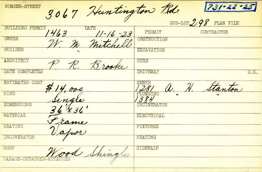 3067 Huntington Road Shaker Heights, OH 44120 PARCEL ID: 731-22-025 Building Permit Date: 11-16-1923 Plan File Number: 0 Neighborhood: Onaway Owner: Mitchell, W. M. Builder: Mitchell, W. M. Architect: Brooke, Philo R. Estimated Cost: 14000 Kind: Single, Single Residence or Dwelling Material: Frame Heating: Vapor Roof: Wood Shingle |