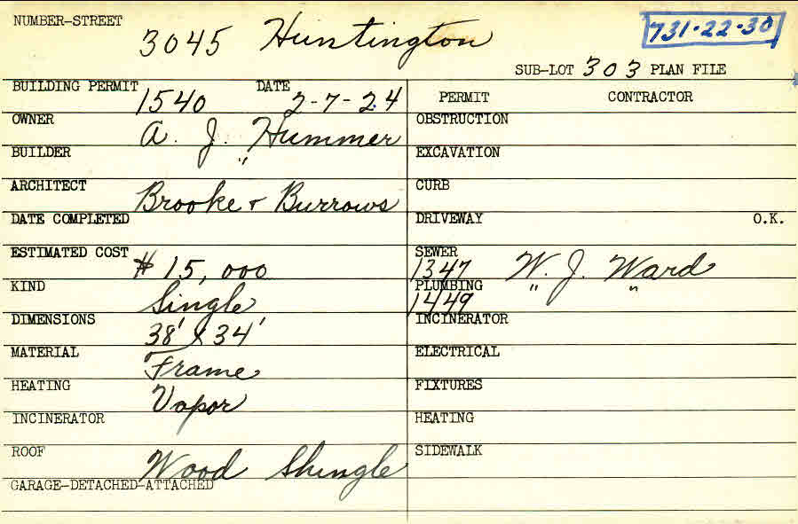 3045 Huntington Road Shaker Heights, OH 44120 PARCEL ID: 731-22-030 Building Permit Date: 02-07-1924 Plan File Number: 0 Neighborhood: Onaway Owner: Hummer, A. J. Builder: Hummer, A. J. Architect: Brooke and Burrows Estimated Cost: 15000 Kind: Single, Single Residence or Dwelling Material: Frame Heating: Vapor Roof: Wood Shingle Card Available: yes |
