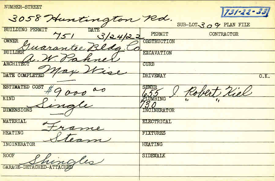 3058 Huntington Road Shaker Heights, OH 44120 PARCEL ID: 731-22-033 Building Permit Date: 03-24-1922 Plan File Number: 4923 Microfilm Roll: Roll#68 Neighborhood: Onaway Owner: Guarantee Building Company Builder: Pahner, A. W. Architect: Wise, Max Estimated Cost: 9000 Kind: Single, Single Residence or Dwelling Material: Frame Heating: Steam Roof: Shingles |