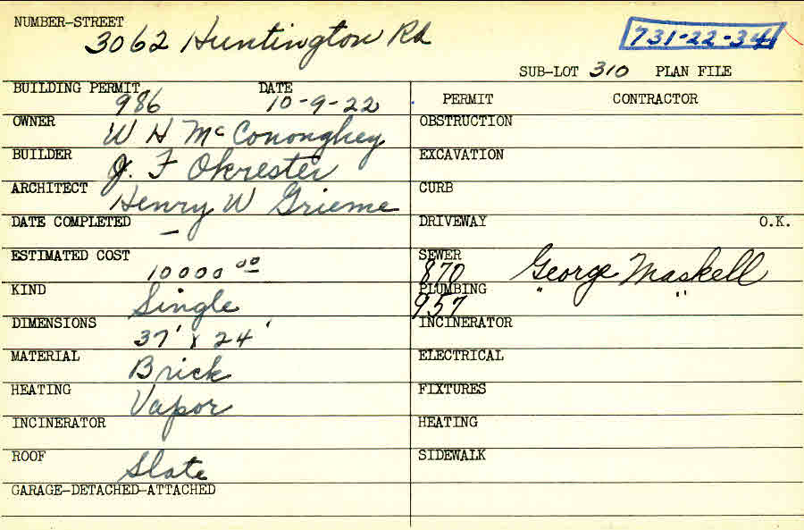 3062 Huntington Road Shaker Heights, OH 44120 PARCEL ID: 731-22-034 Building Permit Date: 10-09-1922 Plan File Number: 0 Neighborhood: Onaway Owner: McCononghey, W. H. Builder: Okrester, J. F. Architect: Grieme, Henry W. Estimated Cost: 10000 Kind: Single, Single Residence or Dwelling Material: Brick Heating: Vapor Roof: Slate Card Available: yes |