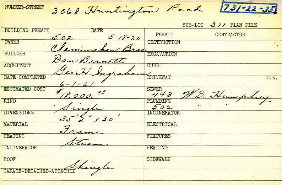 3068 Huntington Road Shaker Heights, OH 44120 PARCEL ID: 731-22-035 Building Permit Date: 05-18-1920 Plan File Number: 0 Neighborhood: Onaway Owner: Cleminskaw Brothers Builder: Bernett, Dan Architect: Ingraham, George H. Estimated Cost: 18000 Date Completed: 06-01-1921 Kind: Single, Single Residence or Dwelling Material: Frame Heating: Steam Roof: Shingles Card Available: yes |